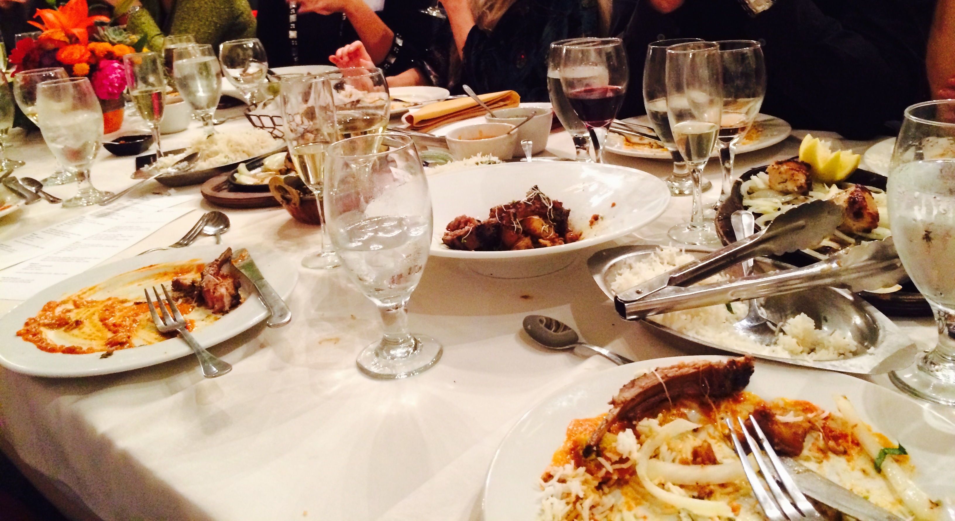 The variety of foods and flavors in our starters was really impressive, but wait, there’s MORE! Chef Navdeeb and staff wowed us with a dazzling entree lineup: Tandoori Lamb Chops, Kothmir Salmon and Shrimp with Tikka Sauce, Malai Kofta, Saag Paneer, Malai Kabon and plenty of Naan and Basmati Rice. Served family style, it was like a royal wedding feast! To complement the savory and spicy flavors, we had Bischofliches Riesling, Paso Creek Zinfandel, and Billhook Cab.